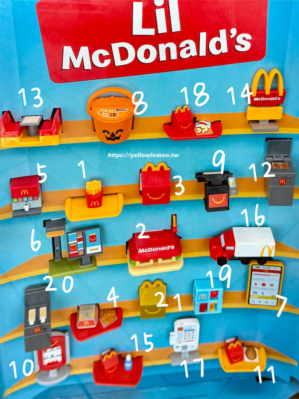 玩具採隨機附贈,但可以從盒底對照編號來避免重複喔。以下是 21 款 Lil’ McDonald’s 玩具的編號與名稱清單。
