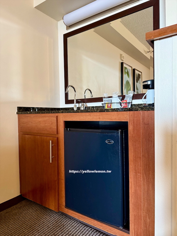 門口這邊就有一個洗手台,洗水果什麼的很方便,下方是小冰箱。