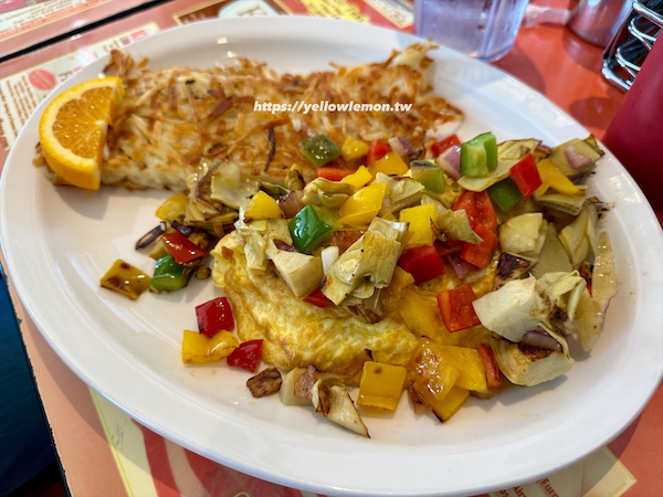 朝氣滿滿的三顆蛋歐姆蕾,有炒洋蔥和甜椒搭配朝鮮薊,口感豐富。