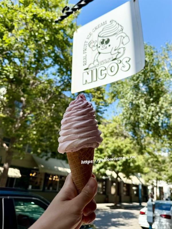 我們點了小孩指定的草莓口味,搭配 kid’s cone。果香濃郁、甜中帶酸,吃得超滿足!Nico’s Ice Cream 的水果冰淇淋真的吃得出天然,難怪會成為 Santa Cruz 美食推薦之一。