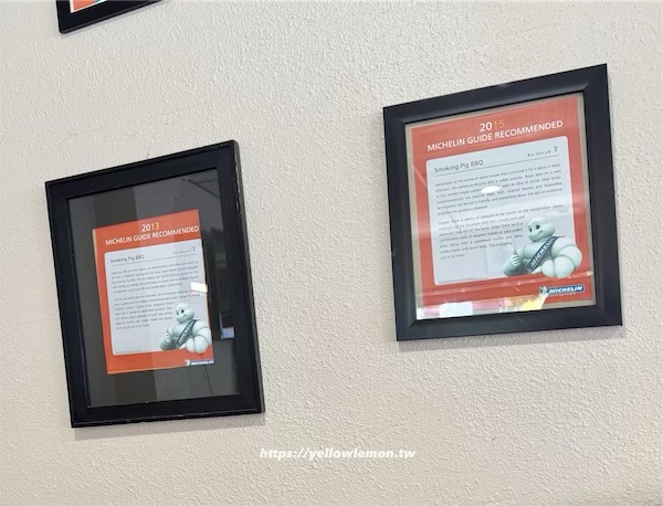 官網上寫著「我們的慢火燻烤肉、手作配菜以及特色調酒,使我們在西部的 BBQ 餐廳中獨樹一格。」牆上也掛滿得獎紀錄、媒體介紹、米其林指南推薦,看得出來是紮實累積的口碑。