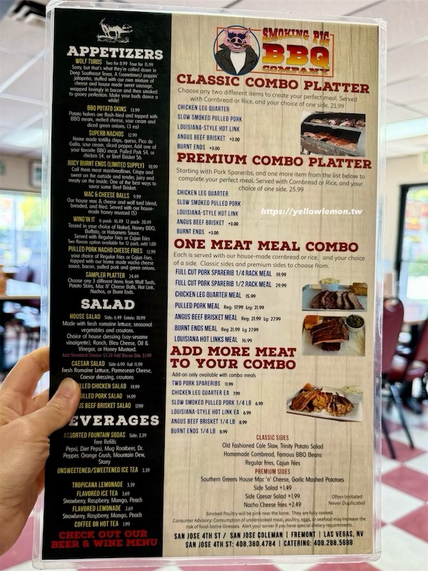 如果你跟我們一樣,在 San Diego 吃過一次驚為天人的豬肋排後總是念念不忘,那麼 Smoking Pig BBQ 依然是灣區值得專程一試的烤肉店。雖然個人覺得豬肋排比不上 San Diego 的 Phil’s BBQ,但牛肉與雞肉表現都很不錯,慢火燻烤的香氣和手作配菜也相當用心,偶爾解解饞完全沒問題。這次我們造訪的是 San Jose 本店,距離市區不遠,也是許多在地人心中的烤肉首選。