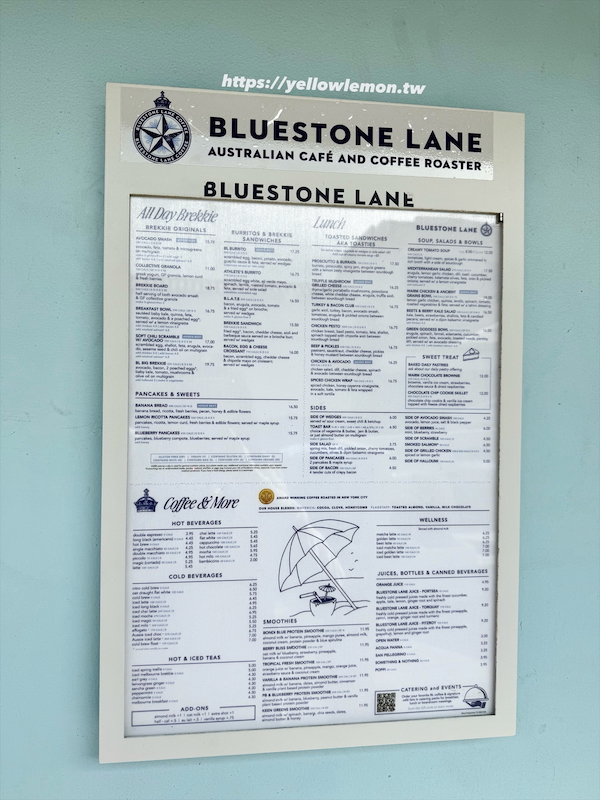 我自己覺得這裡很特別的是,整個空間超舒服,從室內設計到戶外露天座位,都有一種「都市裡喘息角落」的感覺。Bluestone Lane 提供全天候餐點,主打健康取向創新風格。無論是充滿陽光的早餐、清爽的午餐,還是午後的小點心,都能找到合適的選擇。