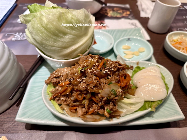 附韓式辣醬、年糕片、蒜片和生菜,豬肉鹹甜鹹甜,跟其他配料包在生菜內一起吃,口感豐富,大大滿足。