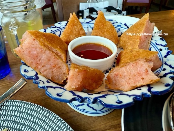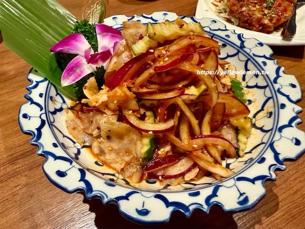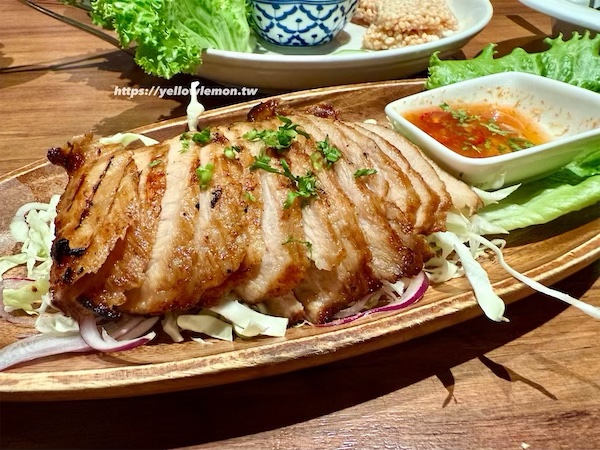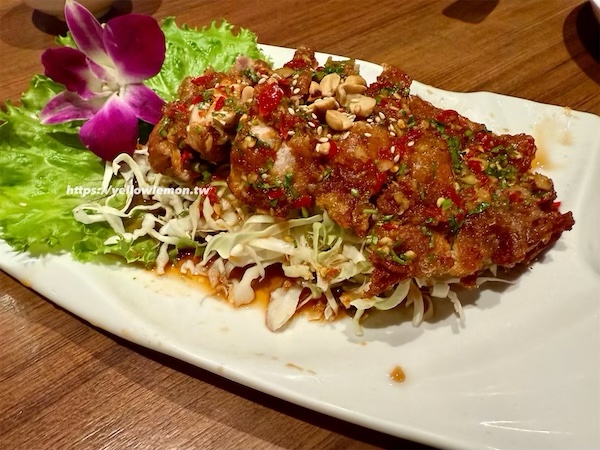 肉質細嫩多汁,搭配現榨檸檬汁、蒜末、香菜與泰式醬汁,酸香微辣、非常夠味。