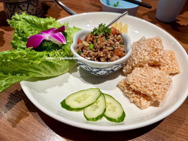 泰式豬肉鍋巴是小孩指著照片說要點的!後來才知道這道是他們的招牌之一。絞肉香氣十足但不油膩,鍋巴酥脆超加分,大人小孩都很喜歡。