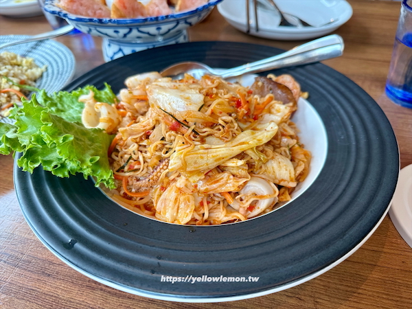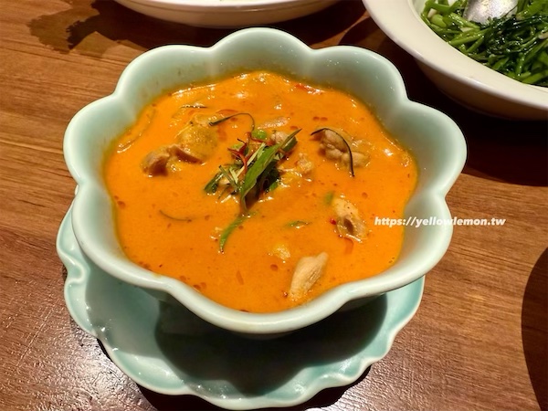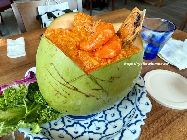 上桌時整個料理裝在一顆完整的椰子裡,非常有特色。裡頭滿滿海鮮,蝦子超大,份量比預期豐富。紅咖哩香濃滑順帶甜味,超級下飯。