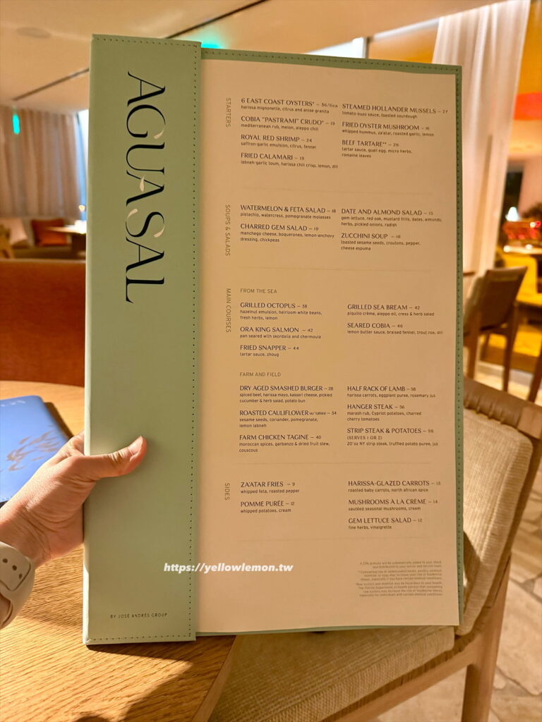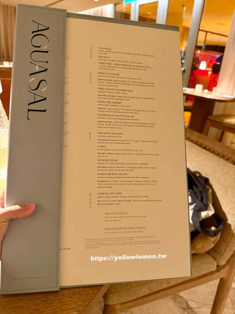 整體來說,Aguasal 的菜色不重鹹、不油膩,吃起來舒服又有層次,完全符合它 “Mediterranean coastal flavors” 的定位。加上是在飯店裡面,不用走出門吹海風或找停車,就是最輕鬆的度假晚餐選擇。