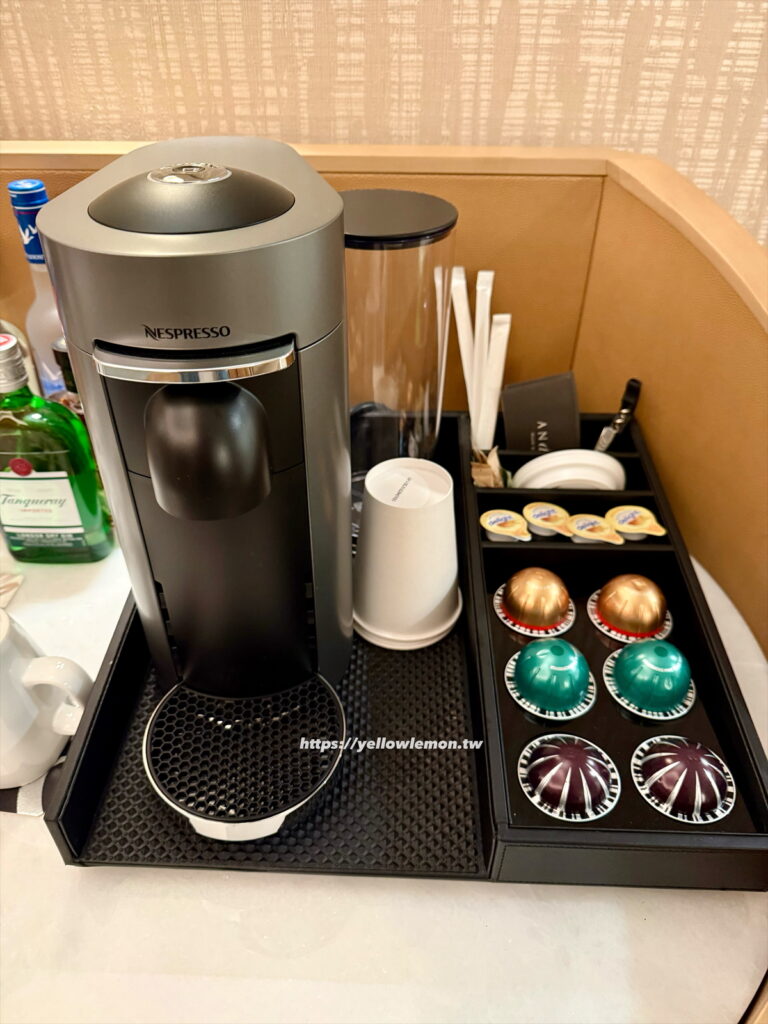 免費的部分是膠囊咖啡和瓶裝水,飯店也有飲水機可以補水,不過只有冷水,要熱水可以到 Bar 拿。