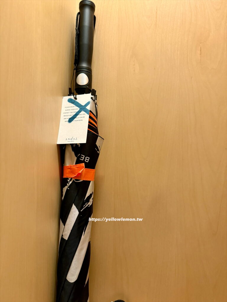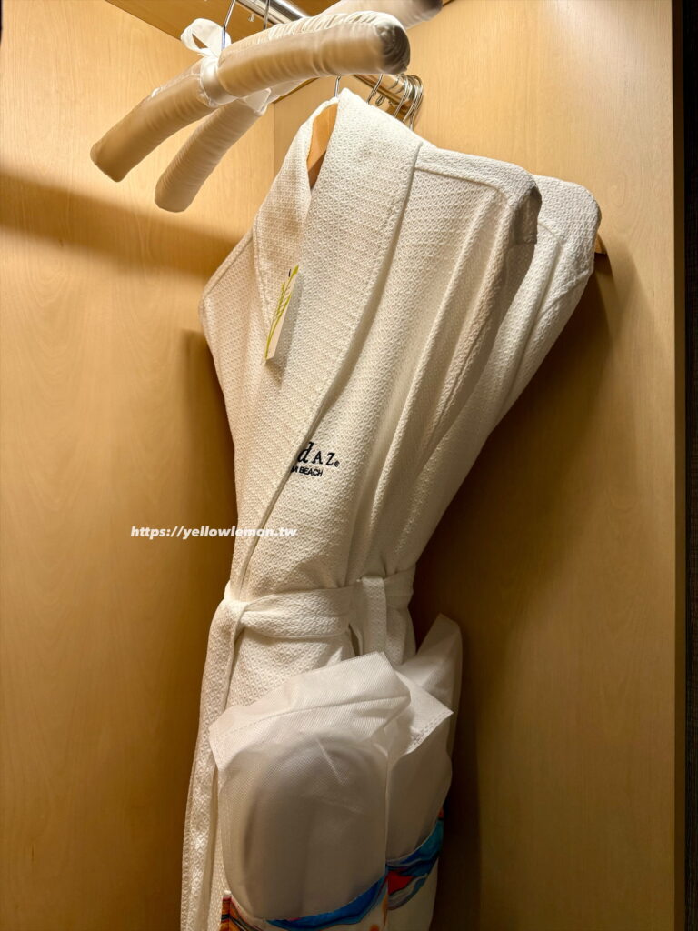 衣櫃裡有印有飯店名稱的手提袋和雨傘,住宿期間都能使用。提袋有拉鍊,帶去沙灘很方便,不怕自己的包包裝滿沙。浴袍、熨斗、室內拖和體重機都有,可惜少了行李架。