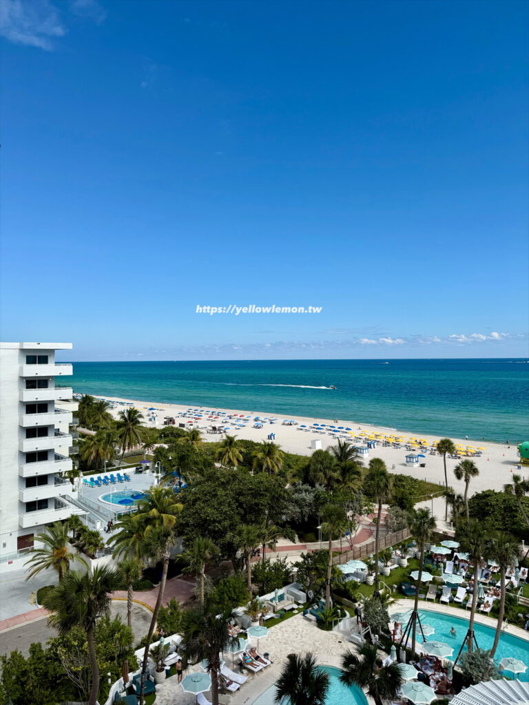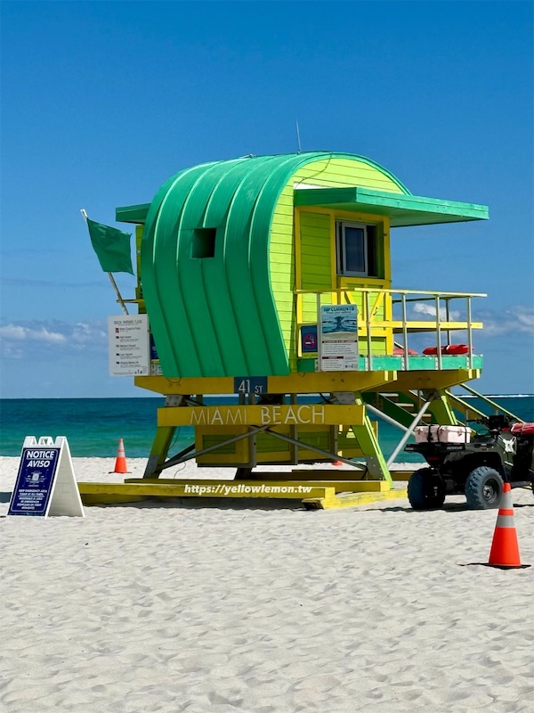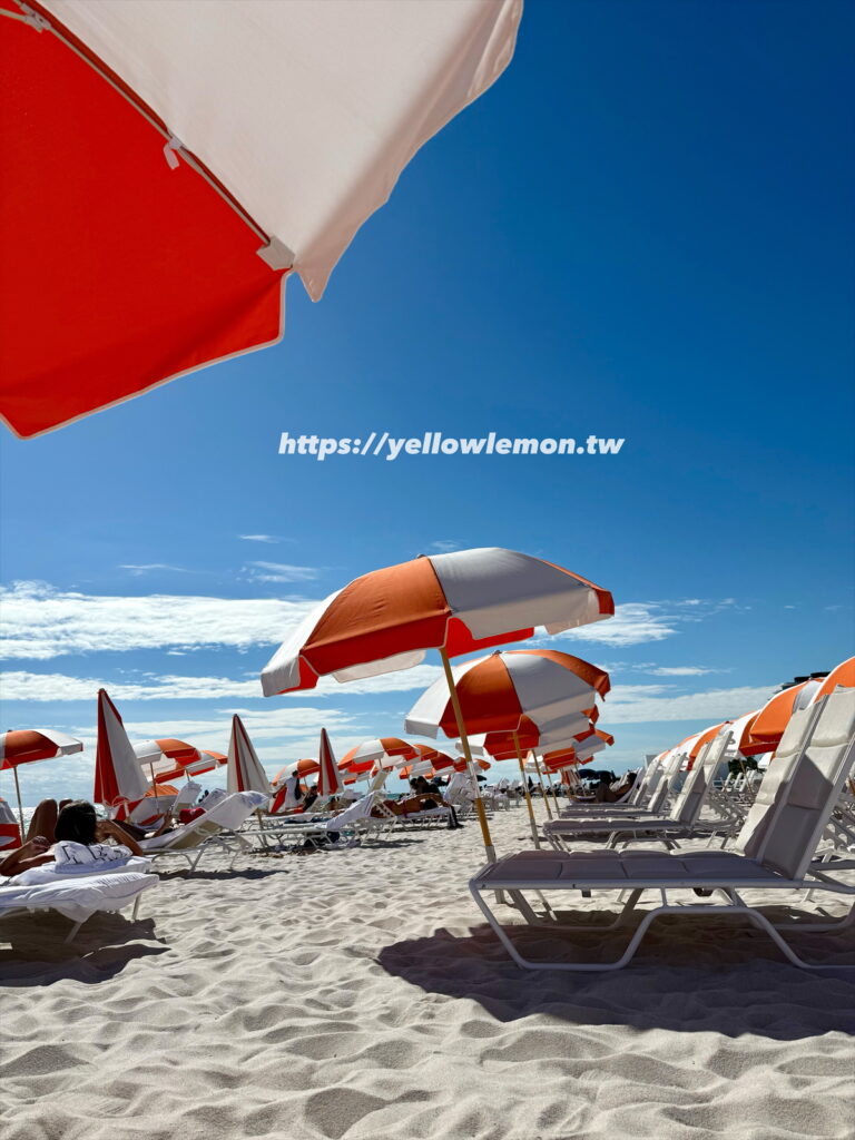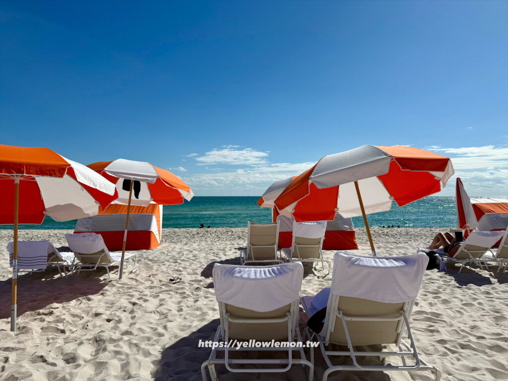 房客還能免費使用兩張沙灘椅與一支遮陽傘,直接到沙灘租借處報房號即可。邁阿密的沙子超細、踩起來很舒服,是那種可以光腳散步、完全放鬆的海灘。