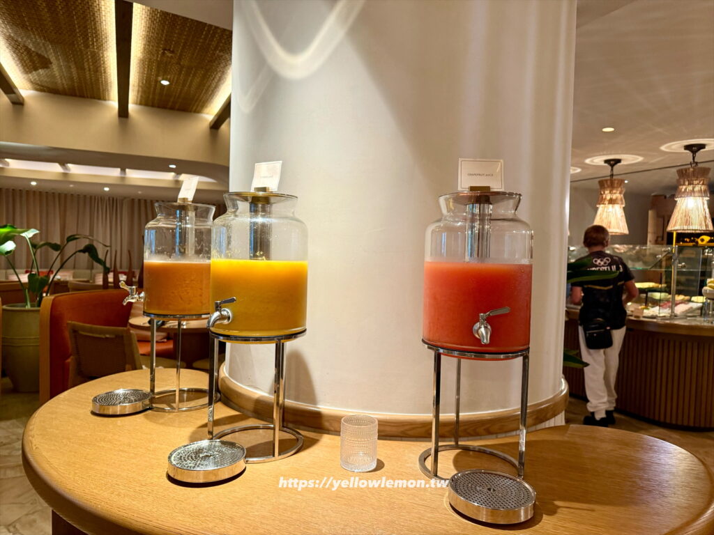 果汁區有柳橙汁、葡萄柚汁和芭樂汁。