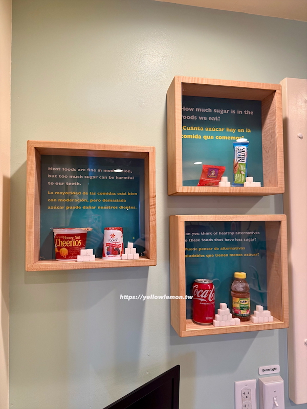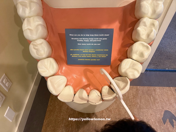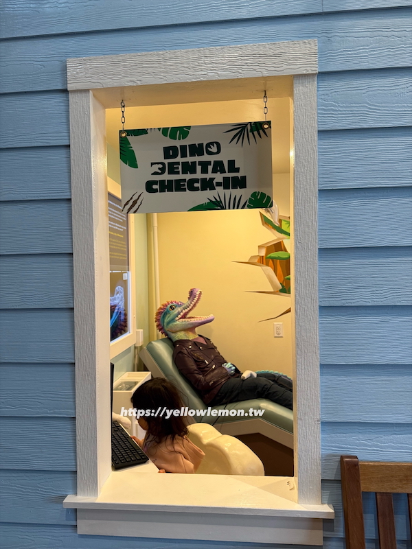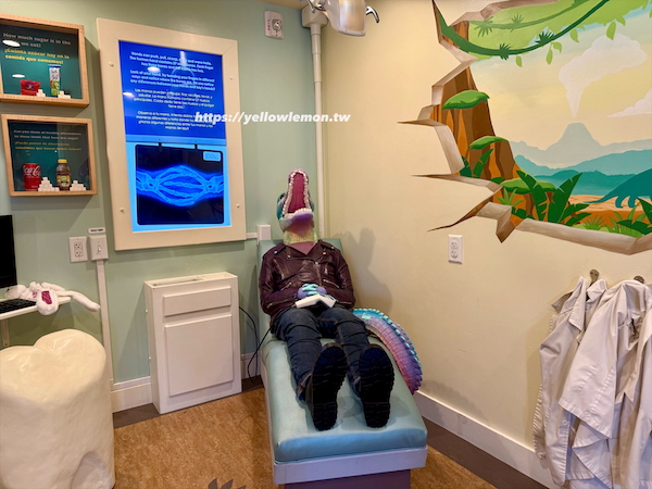 這裡讓孩子當小牙醫,幫恐龍病人檢查牙齒、洗牙、補牙。