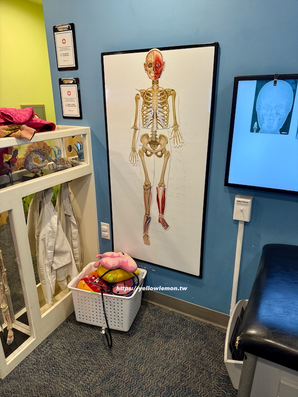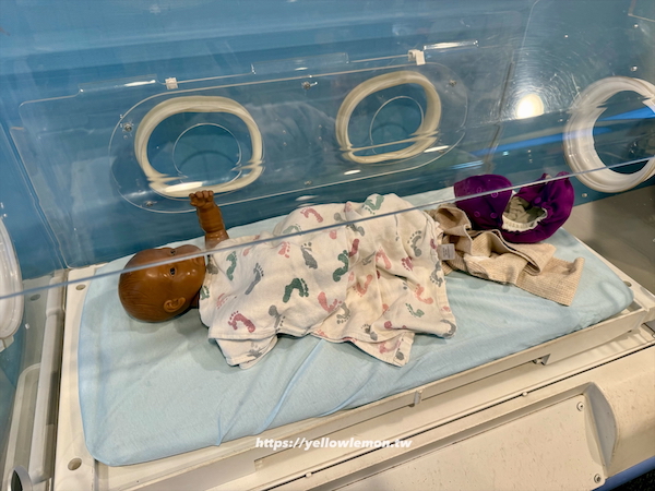 也能照 X 光、假裝幫病人檢查身體,甚至照顧小寶寶、幫嬰兒包包巾,那個包巾就跟醫院用的一模一樣!讓人有點懷念哈哈。