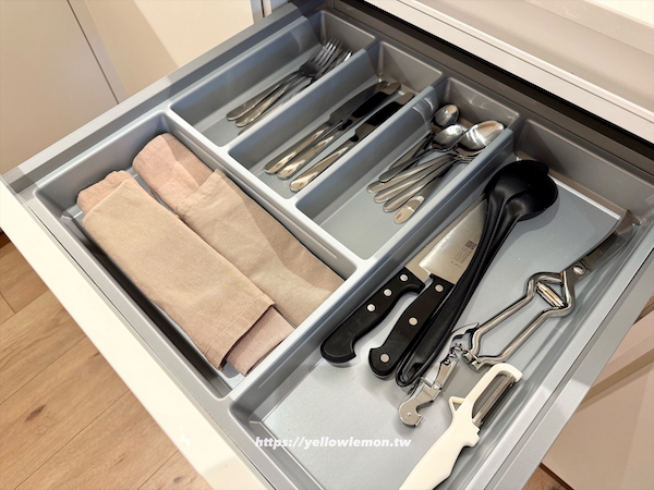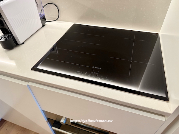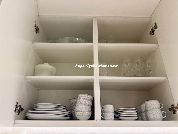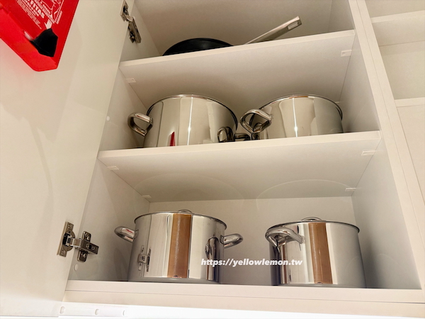 廚房也是完整配備,有爐台、廚具、餐具跟大冰箱,買水果、飲料回來都很方便,要是想簡單煮個東西也可以,而且有大水槽可以洗奶瓶和水壺也超讚!