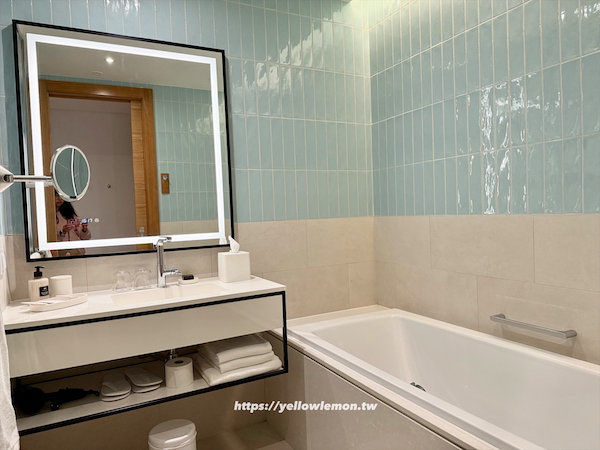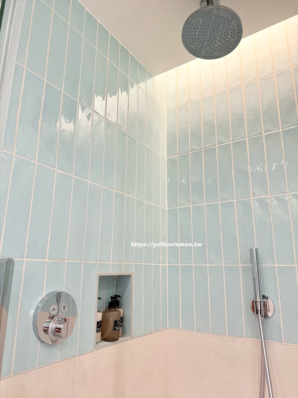 浴室空間也很大,水藍色的磁磚令人神清氣爽。