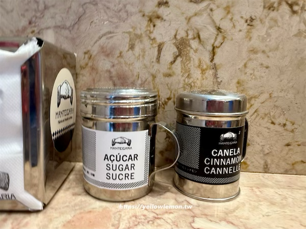 桌上還有肉桂粉和糖粉可以自行添加。