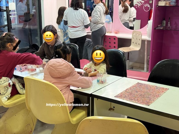 女兒選了做指甲,由另一位年紀較大的小朋友幫她塗指甲油,做完後好幾天都小心翼翼,深怕洗掉。