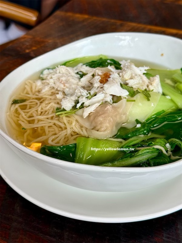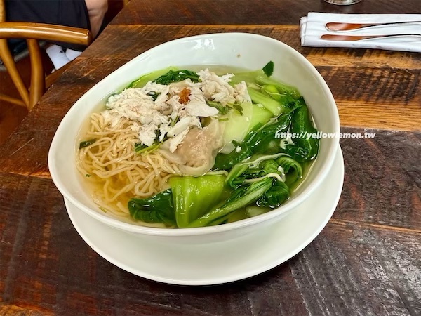 另一道是 Crab & Pork Wontons Egg Noodle,蟹肉直接鋪在麵上,還不小心咬到一點蟹殼,只能安慰自己這代表是真的蟹肉。湯頭清爽,整體吃起來很舒服,是會讓人安靜把整碗吃完的一道。