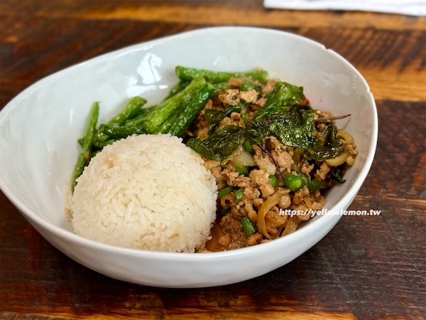 這次點了 泰式打拋雞Spicy Basil Chicken),香氣很到位,辣度明確但不嗆口,是那種白飯會在不知不覺中被清空的打拋雞。配菜搭的是四季豆,份量不少,吃起來也很有誠意。