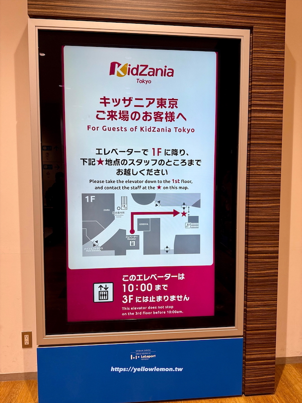 需要特別注意的是,KidZania 位在購物中心內,如果是第一場一早入場,賣場尚未開始營業,必須依照指標走 KidZania 專屬手扶梯 上樓,第一次來記得留意標示,不然很容易看得到但走不到。
