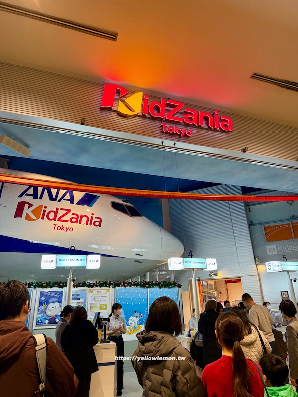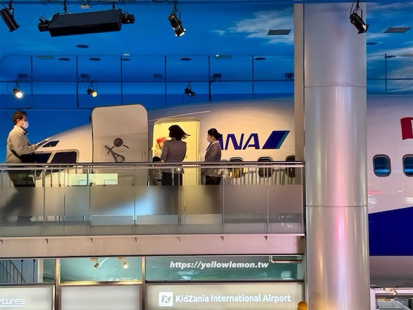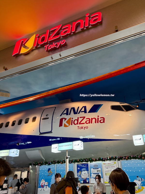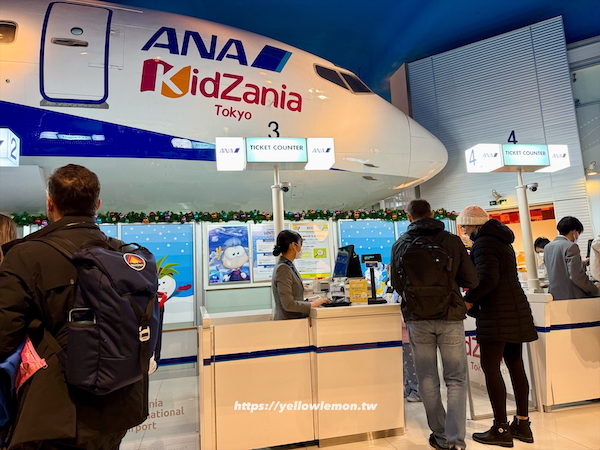在東京 KidZania 的入口處會看到一架很醒目的 ANA 飛機模型,因為ANA(全日空)是 KidZania 東京、KidZania 甲子園與 KidZania 福岡的官方贊助商。入口設計成機場的報到櫃檯外,門票也可以使用ANA 電子禮券 來兌換喔。