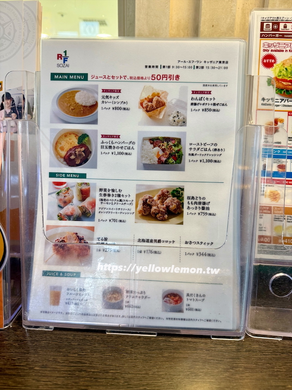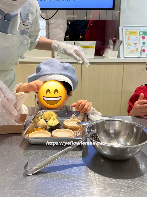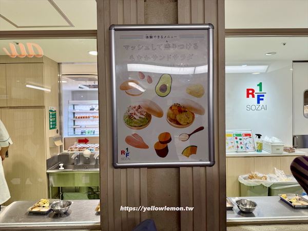 RF1 是日本很常見的沙拉與熟食品牌,KidZania 裡的 RF1 沙拉體驗,把平常在櫃檯前看到的流程完整搬進來,先簡單介紹食材,孩子再實際動手組裝沙拉,過程看起來簡單,卻需要專心又細心。