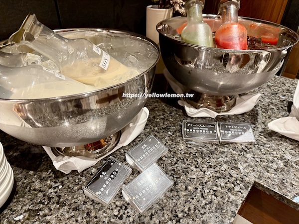 牛奶、豆漿和果汁,其他罐裝飲料則在冰箱中,全天候都有提供。